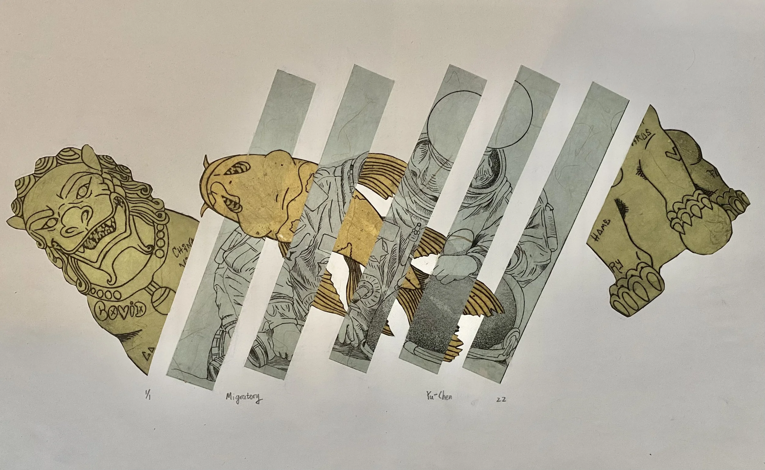 Migratory is one of my experiments with new material. For this collage, I collected printmaking pieces from classmates with different identities, shredded them and reassembled them into a brand-new dynamic identity. By recontextualization, I destroy the original meanings of fish, stone lion and astronaut and make them components of a new symbol, by which I want to let the viewers rethink about the meaning of the symbol and the essence of their own identity.